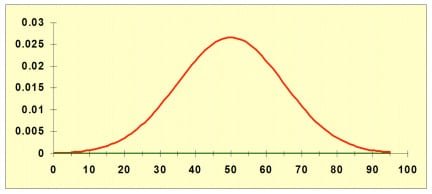Just a lucky streak for both Maris and the broker? That is where I struggled with his conclusions and I’m sure many of you are already thinking about writing me to explain both Maris’s season and the broker’s streak. Please send your rebuttals to Mlodinow, not me. Where he really struck close to home was his question of the practice of replacing the successful coach or leader after a few losing years or seasons. He questions the current wisdom that they have lost their “touch” and proposes that it was just the many other factors that lined up against the leader to give them a losing season or year, or two, or three. In reading Mlodinow’s book I had the impression that he was underestimating the influence of the leader in comparison to all the other factors that can influence results. Now as a sports fan, student of leadership, trainer of leadership, and a small company leader myself, this caused me to spend some time contemplating the question: How much influence does a leader have on the results of their organization? After thinking about my own experiences and knowledge of many leaders, I respectfully disagree with Mlodinow and would be willing to bet that most leaders don’t realize just how much influence (good and bad) they really do have on their people and organization. I agree that the yearly results will vary greatly independent of the leader, and some factors like our current economic downturn can have a huge impact on an organization’s results, but I think Mlodinow would agree that each leader can have vastly different “measures of central tendency”. Measures of central tendency is a statistical term meaning the results of a process will group around a center point of the complete distribution of the results. Below is an example of a distribution where the center is pretty obvious.